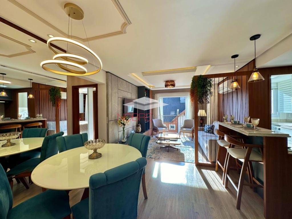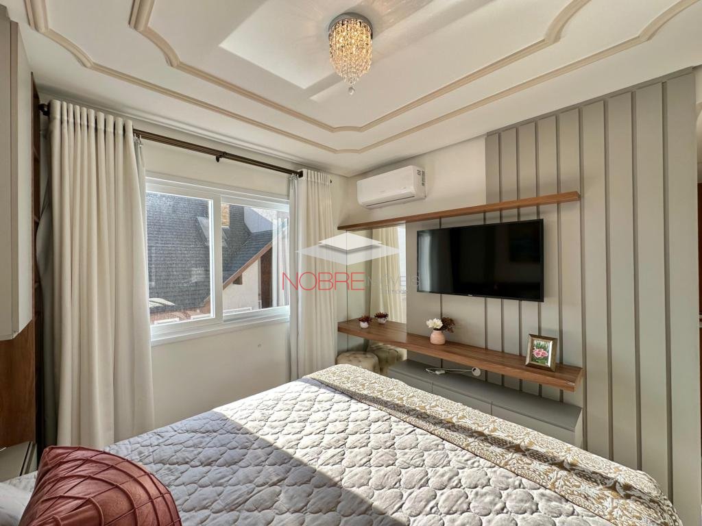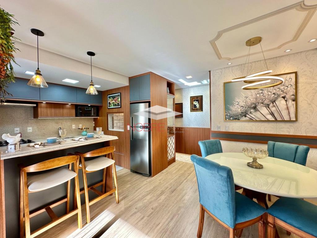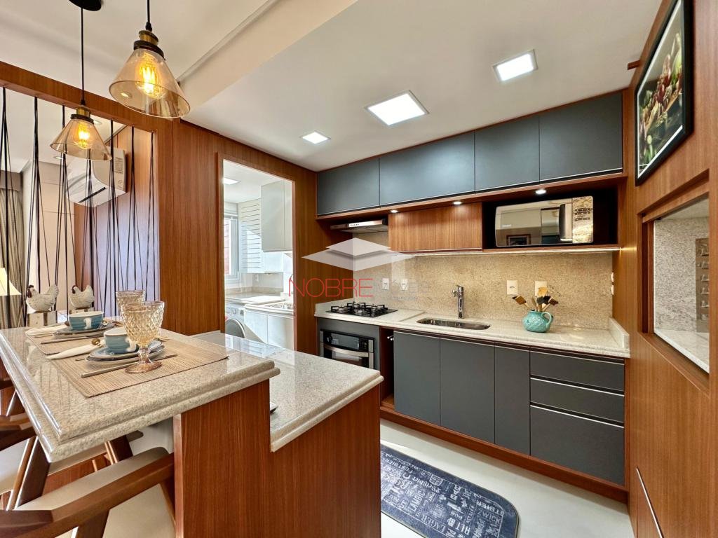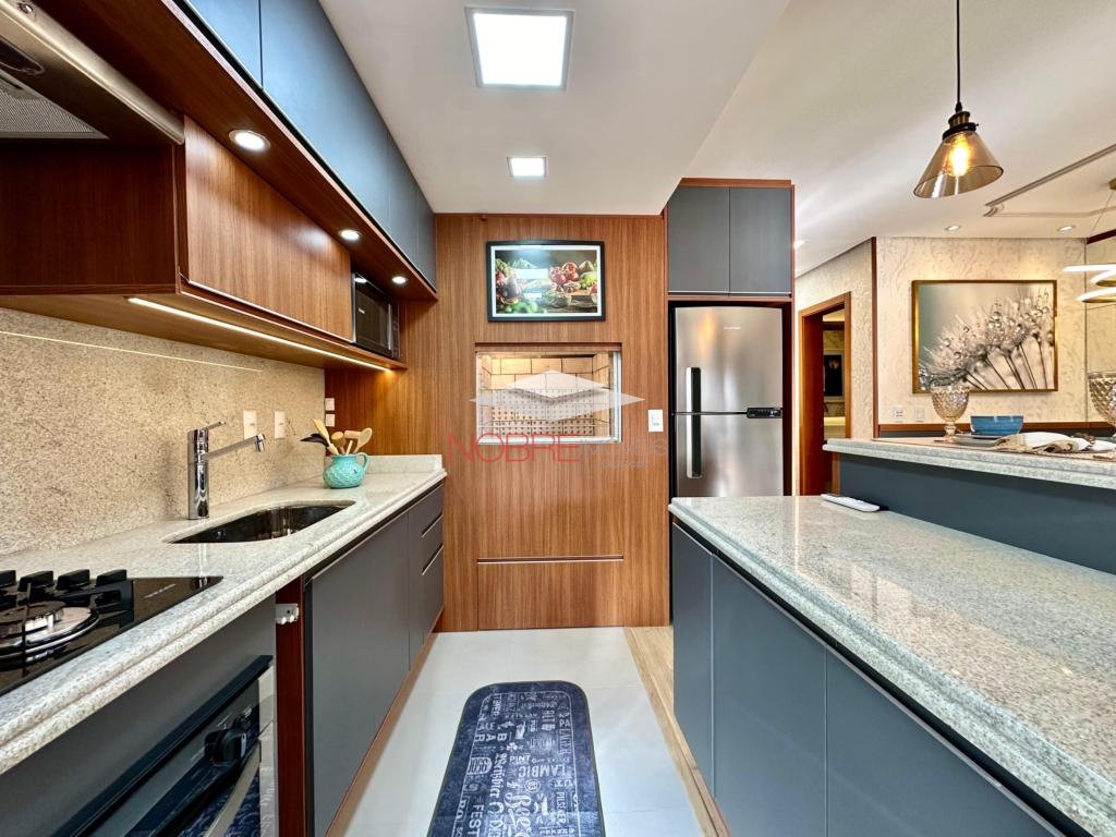 Composto de 02 suítes, lavabo, cozinha americana com churrasqueira, living com espera para lareira, sacada integrada, calefação e split instalado. Piso porcelanato e laminado. Posui um box de garagem.