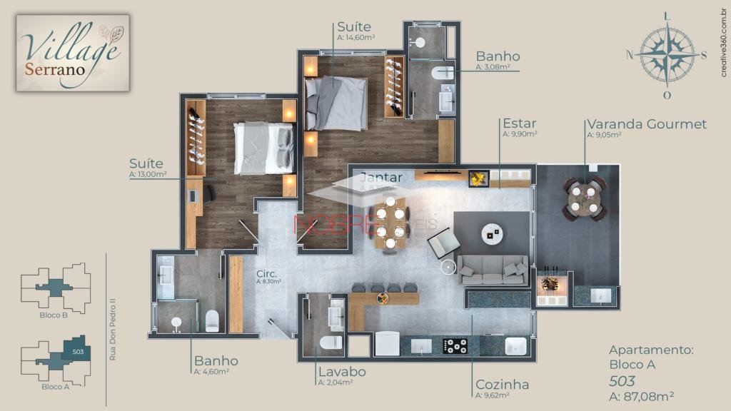 Nobre Imoveis vende apartamento medindo 87,45m² de área privativa composto por 02 quartos(suítes), lavabo, cozinha americana, sala de estar e jantar integrados, espaço gourmet, churrasqueira, hall de entrada e 02 vagas de garagem.